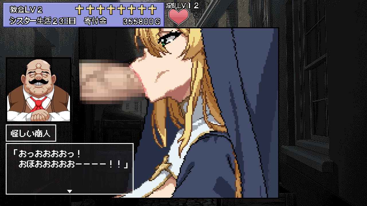 【ドットアニメーション・教会再建SLG】教会の立て直しを図るべく、自らの身体を使い寄付金を貯める。ボタン選択式ドット絵アニメシミュレーション。