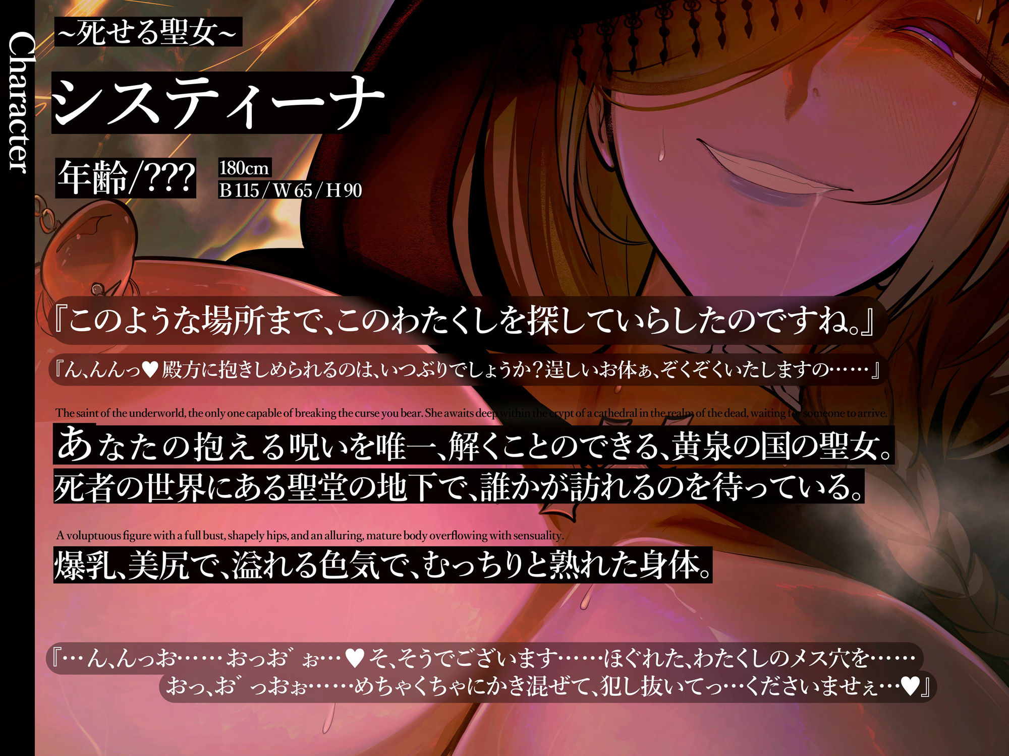 その身に受けた呪いを解くため、黄泉の国の深くまで訪れたあなたは、聖堂の地下墳墓で冥界の神に仕える聖女システィーナと出会う。『剣士がつるぎを振るう力を奪われてしまって、さぞ難儀な事でしょう。あなたのお見立ての通り、わたくしであれば、その呪いをお祓いすることができます…ただ、そのためには─』この怪しげな女性曰く、彼女と同衾すれば呪いを解くことができるというが…