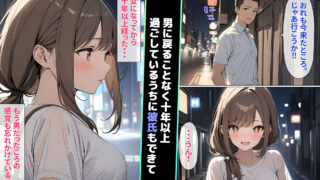 男の娘になったあなたに対し、花さんが「女の子」について教えてくれます。まずは女の子のオシッコの仕方。はなさんがトイレで女の子のオシッコを見せながら、音を聴かせてくれます。ただ、花さんの割れ目と、そこから出てくるオシッコを見ていると、あなたは女の子のはずなのに、つい男みたいに勃起をしてしまいました。それを見て怒った花さんはそのままトイレで…。