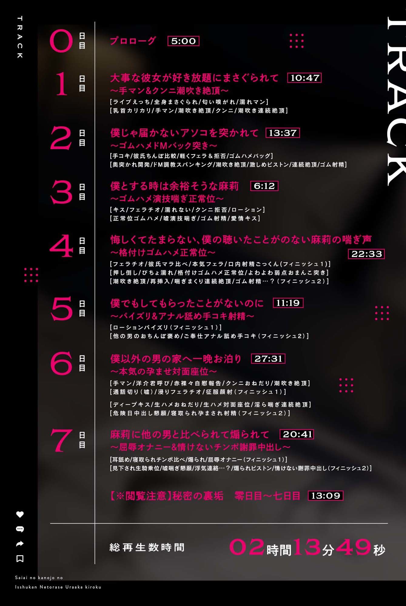 ジャンル: 寝取り・寝取られ・NTR、中出し、退廃・背徳・インモラル、男性向け、成人向け、バイノーラル、妊娠・孕ませ、連続絶頂