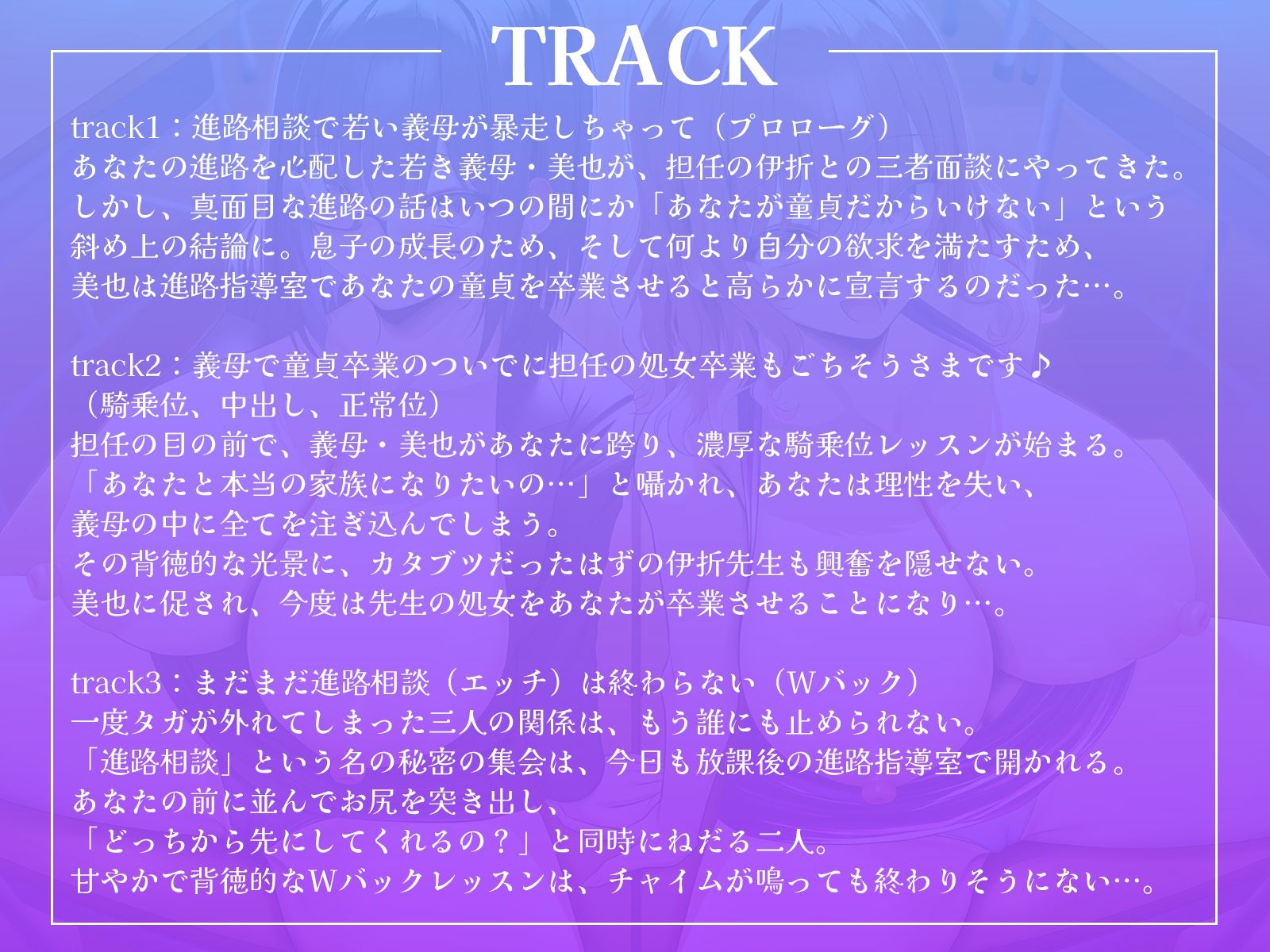 あなたの進路を心配した若き義母・美也が、担任の伊折との三者面談にやってきた。しかし、真面目な進路の話はいつの間にか「あなたが童貞だからいけない」という斜め上の結論に。息子の成長のため、そして何より自分の欲求を満たすため、美也は進路指導室であなたの童貞を卒業させると高らかに宣言するのだった…。