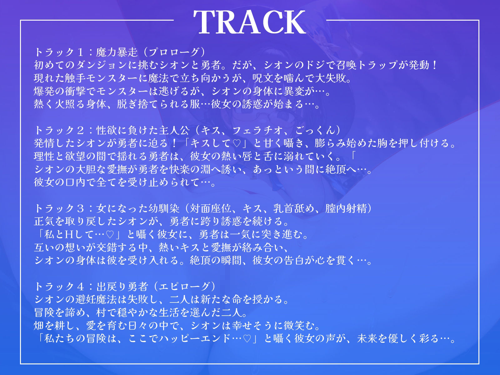 ジャンル: ファンタジー、処女、幼なじみ、中出し、フェラ、ラブラブ・あまあま、男性向け、成人向け、バイノーラル、魔法使い/魔女、オホ声、KU100