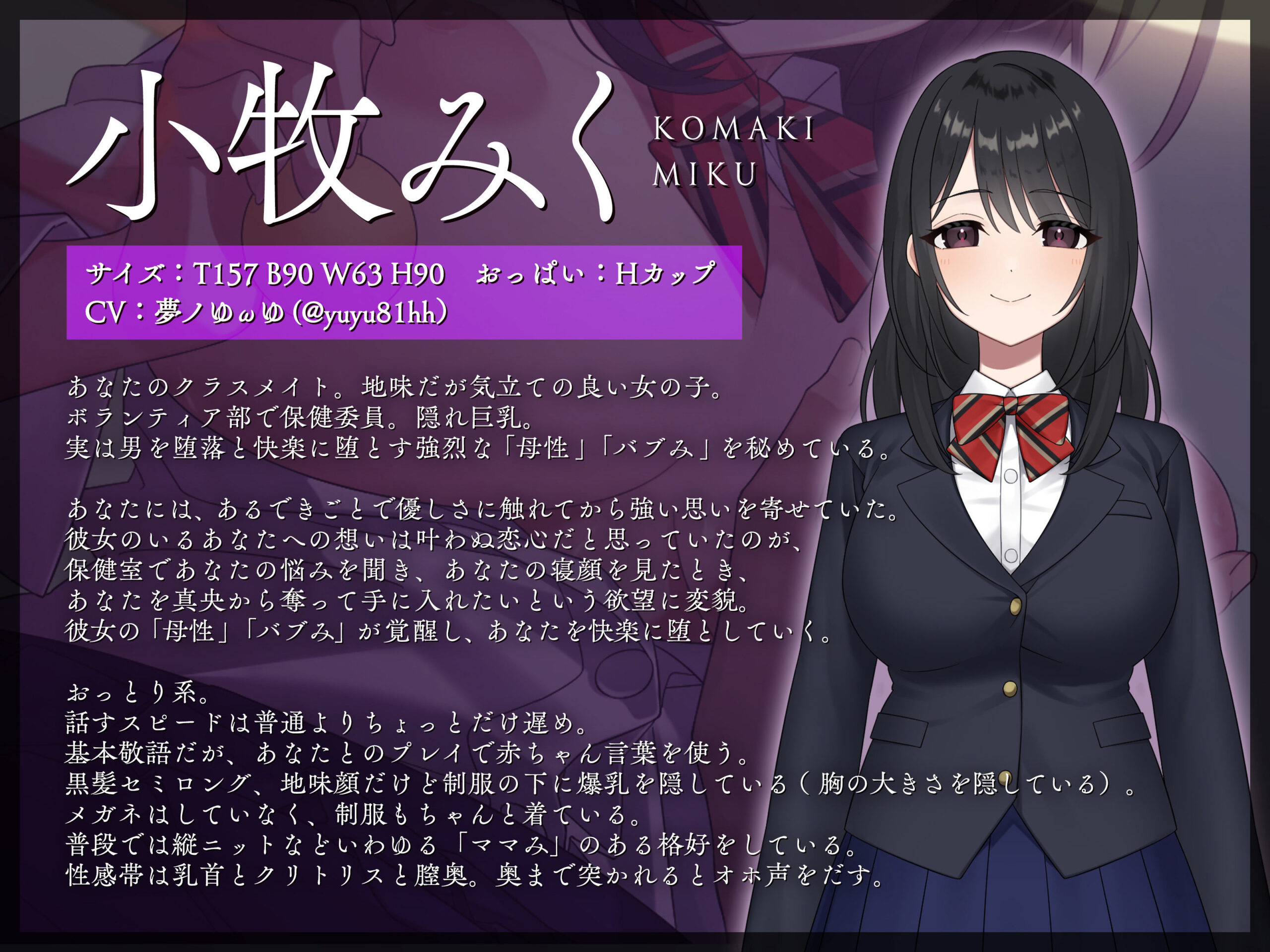 黒髪セミロング、地味顔だけど制服の下に爆乳を隠している(胸の大きさを隠している)。