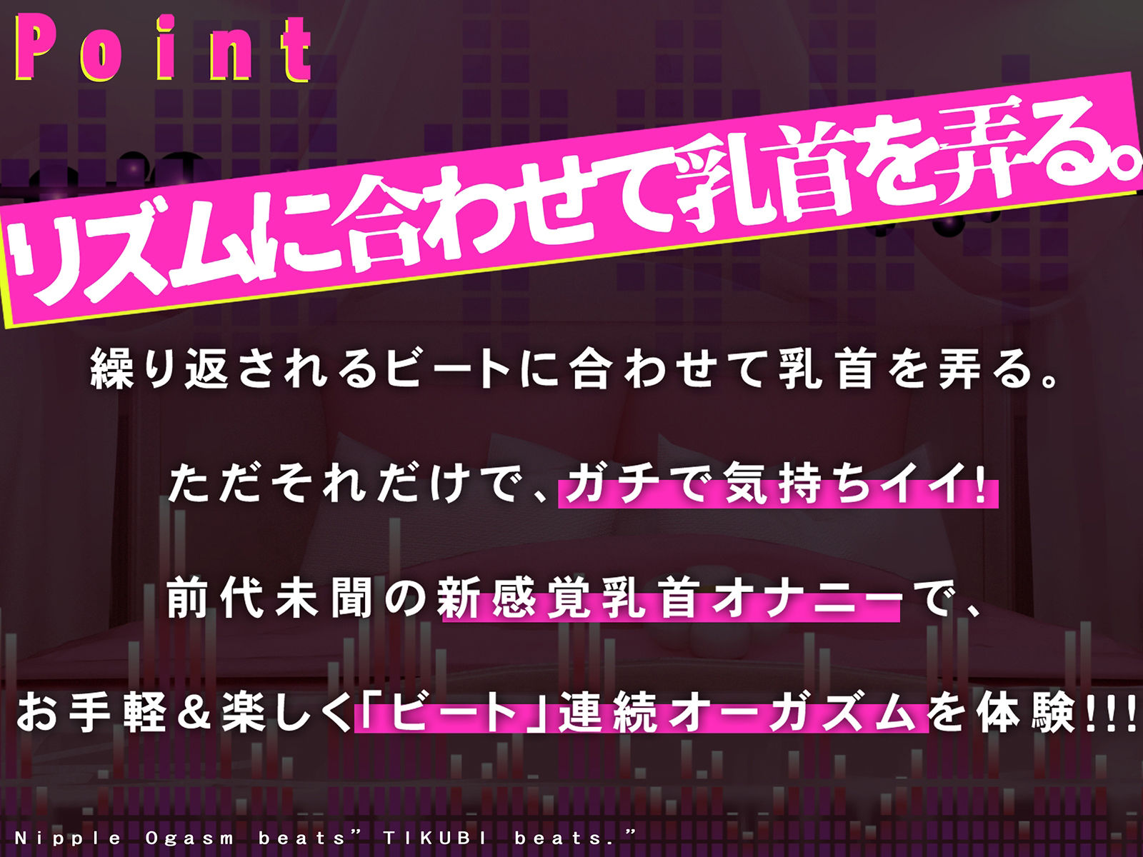 難しいルールは一切なし!繰り返されるビートに合わせて乳首を弄るだけ!右から左から次々囁かれる指示にでいつの間にか両指が止まらない…。新感覚乳首オナニーでお手軽&楽しく「ビート」連続オーガズムを体験!!!