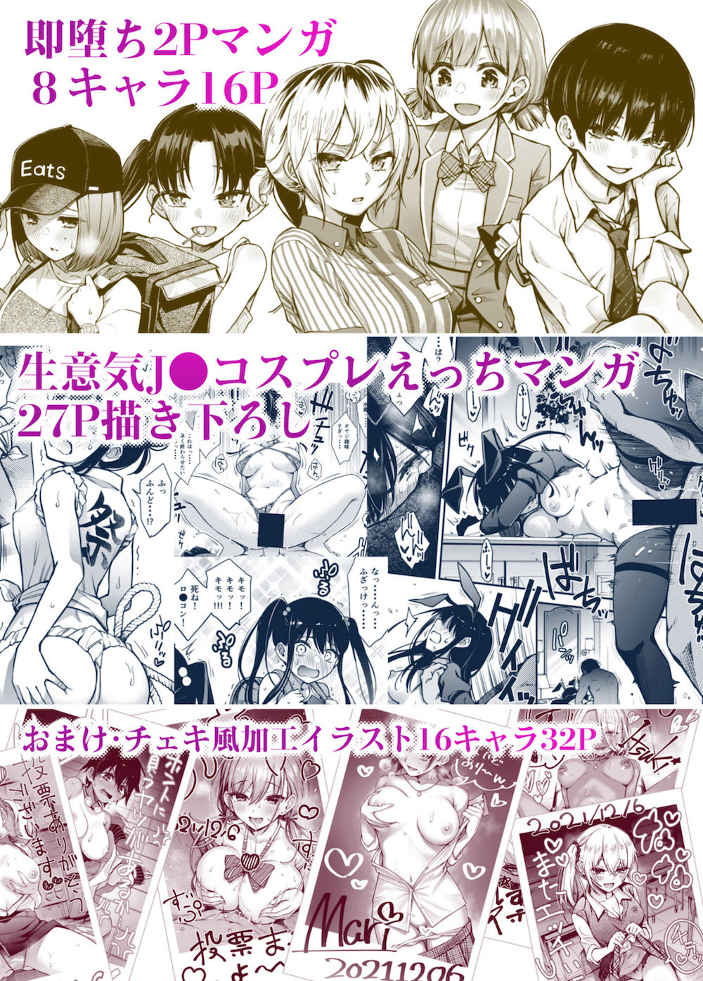 ギャル、罵倒●●、義理の妹、催●コンビニ先輩、バーガーショップ店員etcetc・・・・各キャラのシチュエーションイラストまとめに加え、人気投票で1位になった「柚月れいな」のコスプレえっち漫画を27ページの大ボリュームで描き下ろしました!